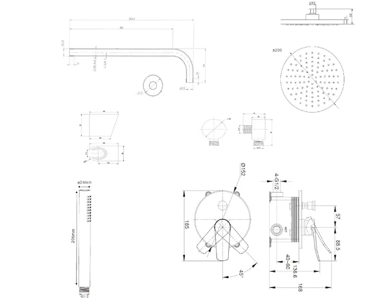 horní sprchu 200 mm se sprchovým ramenem 350 mm