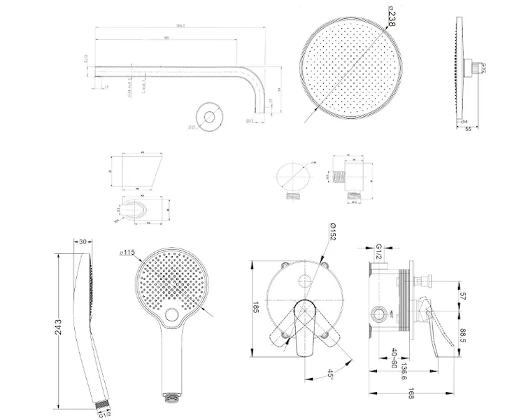 horní sprchu 238 mm se sprchovým ramenem 350 mm