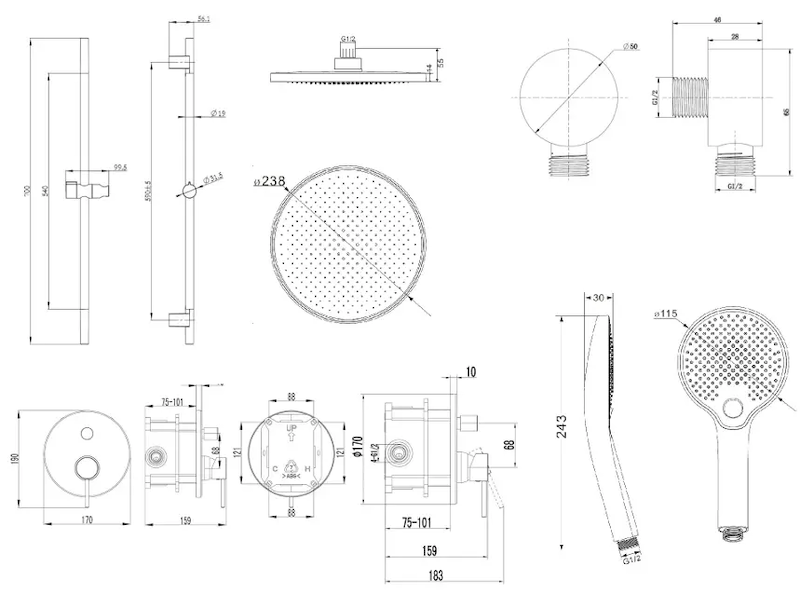 horní sprchu 238 mm se sprchovým ramenem 350 mm
