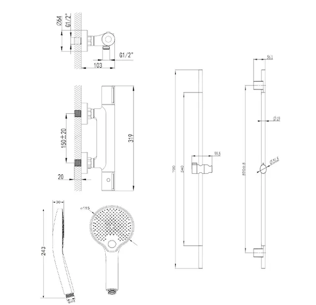 sprchovou tyč 700 mm