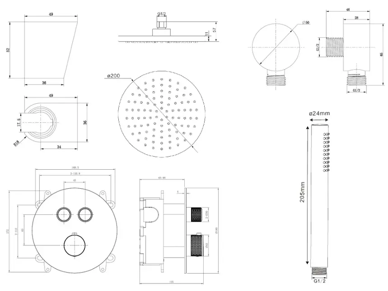 horní sprchu 200 mm se sprchovým ramenem 350 mm