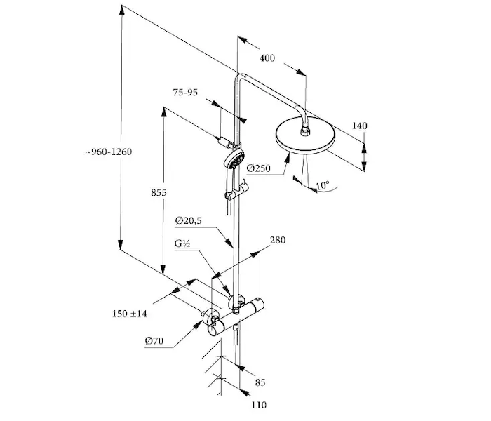 - sprchová tyč 960 - 1260 mm