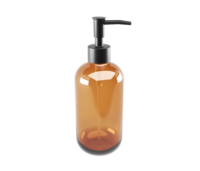 Dávkovač na tekuté mýdlo z průsvitného hnědého skla v lesklém provedení. Pumpička plastová, černá matná. Objem 370 ml.