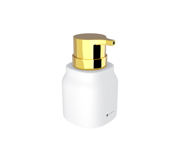 Keramický dávkovač na tekuté mýdlo bílý matný. Pumpička plastová zlatá lesk. Objem 400 ml. Soft-touch povrch.