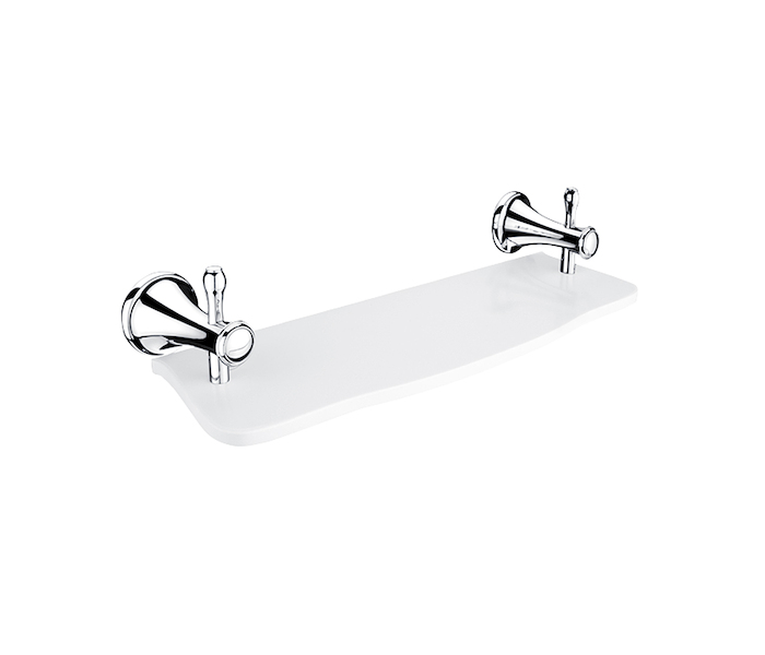 Police z bílého umělého kamene. Délka 40 cm. Úchyty mosaz s povrchovou úpravou chrom.
