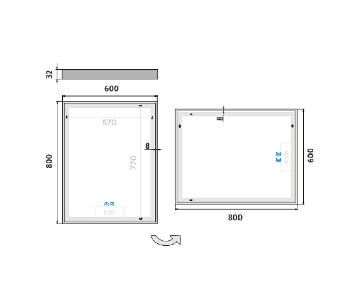 Obdélníkové zrcadlo s rámem s ostrými rohy a celoobvodovým svícením pro dokonalé a rovnoměrné osvětlení. Zrcadlo se ovládá dvěma dotykovými podsvícenými senzory, které umožňují změnu barvy světla, nastavení intenzity osvětlení (stmívání) a disponují paměťovou funkcí pro uložení posledního nastavení. Kromě toho lze zrcadlo ovládat i pomocí nástěnného vypínače, což zvyšuje jeho flexibilitu a pohodlí použití. Pro dosažení kvalitního a rovnoměrného svícení je použit akrylový difuzor, který zajišťuje měkký a harmonický rozptyl světla bez viditelných bodových zdrojů. LED diody jsou vkusně integrovány do rámu spolu s difuzorem, což přispívá k elegantnímu a čistému vzhledu zrcadla. Zrcadlo využívá nejmodernější LED čipy SMD 2835, které jsou známé svou vysokou svítivostí, energetickou úsporností a dlouhou životností. Hustota čipů 96+96/m (192/m), životnost 50 000 hodin. Parametry LED: Survival Factor = 1, Lumen Maintenance Factor 0,99 a Flicker Metric 0,02, pak zajišťují stabilní, bezblikavé a dlouhodobě konzistentní osvětlení. Nosná konstrukce zrcadla je vyrobena z masivního hliníkového rámu o rozměrech 32x19 mm, který zajišťuje vysokou pevnost a stabilitu. Stejně tak je z hliníku vyroben kryt zdroje a všech elektronických součástek. Sklo o tloušťce 5 mm je opatřeno bezpečnostní fólií, která chrání před zraněním v případě rozbití. Zrcadlo navíc disponuje stupněm ochrany proti vlhkosti IP44, což zaručuje spolehlivost i v prostředí s vyšší vlhkostí. Zrcadlo splňuje všechny české normy a je opatřeno českým certifikátem CE, který zaručuje jeho kvalitu a bezpečnost. Nabízí flexibilní možnosti upevnění, a to jak vertikálně, tak horizontálně, a je dodáváno včetně kompletní montážní sady a kabelové spojky s ochranou IP44. Pro zajištění bezpečné přepravy je zrcadlo pečlivě zabaleno a připraveno k expedici prostřednictvím kurýrní služby. Ovládání: Dotykové senzory + možnost ovládání nástěnným vypínačem Nastavení barvy světla: Ano Barva světla: Nastavitelná v rozsahu 3000–6500 K (od teplé po studenou bílou) Funkce stmívání: Plynulé stmívání Paměť nastavení: Automatická paměť nastavení Konstrukce svícení: K rovnoměrnému rozptylu světla zrcadlo disponuje akrylovým matovaným difuzorem Integrace LED: Led diody jsou zabudované v rámu LED čip: Nejmodernější LED čipy SMD 2835 LED pásek - hustota čipů: 192/m (96+96/m) Životnost LED čipů: Až 50 000 hodin Kvalita osvětlení LED: Survival Factor = 1; Lumen maintenance factor = 0,99; Flicker metric = 0,02 Materiál: Zrcadlové sklo, hliník Materiál konstrukce: Rám zrcadla a kryt zdroje jsou vyrobeny z hliníku Tloušťka skla: 5 mm Ochrana při rozbití: Bezpečnostní fólie Stupeň ochrany: IP 44 Certifikace: Český certifikát CE Umístění: Montáž na stěnu Možnost upevnění vertikálně i horizontálně Montážní příslušenství: Součástí balení je montážní sada a kabelová spojka s ochranou IP 44 Obal: Zabalené pro přepravu kurýrní službou Napětí: Vstupní napětí 220-240 V Výstupní napětí 12 V Příkon: 41 W, světelný tok: 2952 lm Rozměr: v: 800 mm š: 37 mm d: 600 mm Hmotnost: 8,26 kg