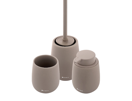 V sadě dávkovač tekutého mýdla, pohárek na kartáčky a WC kartáč. Nádobky keramické TAUPE matné. Objem dávkovače 425 ml. Pumpička plast. Rukojeť kartáče nerez ocel. Soft-touch povrch.