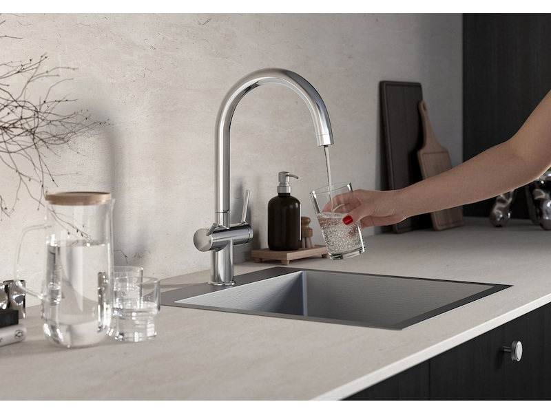 Ferro Filtrata je nejen krásná, ale i praktická – umožňuje výdej běžné i filtrované vody v jednom těle baterie. Díky tomu šetří místo, čas i životní prostředí.