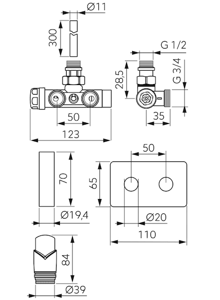 • integrovaný úhlový ventil s přednastavením a 1/2‘ radiátorovou přípojkou