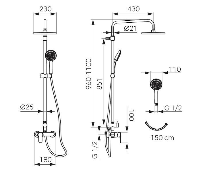 - Výška tyče pevné sprchy [mm]: 960-1100
